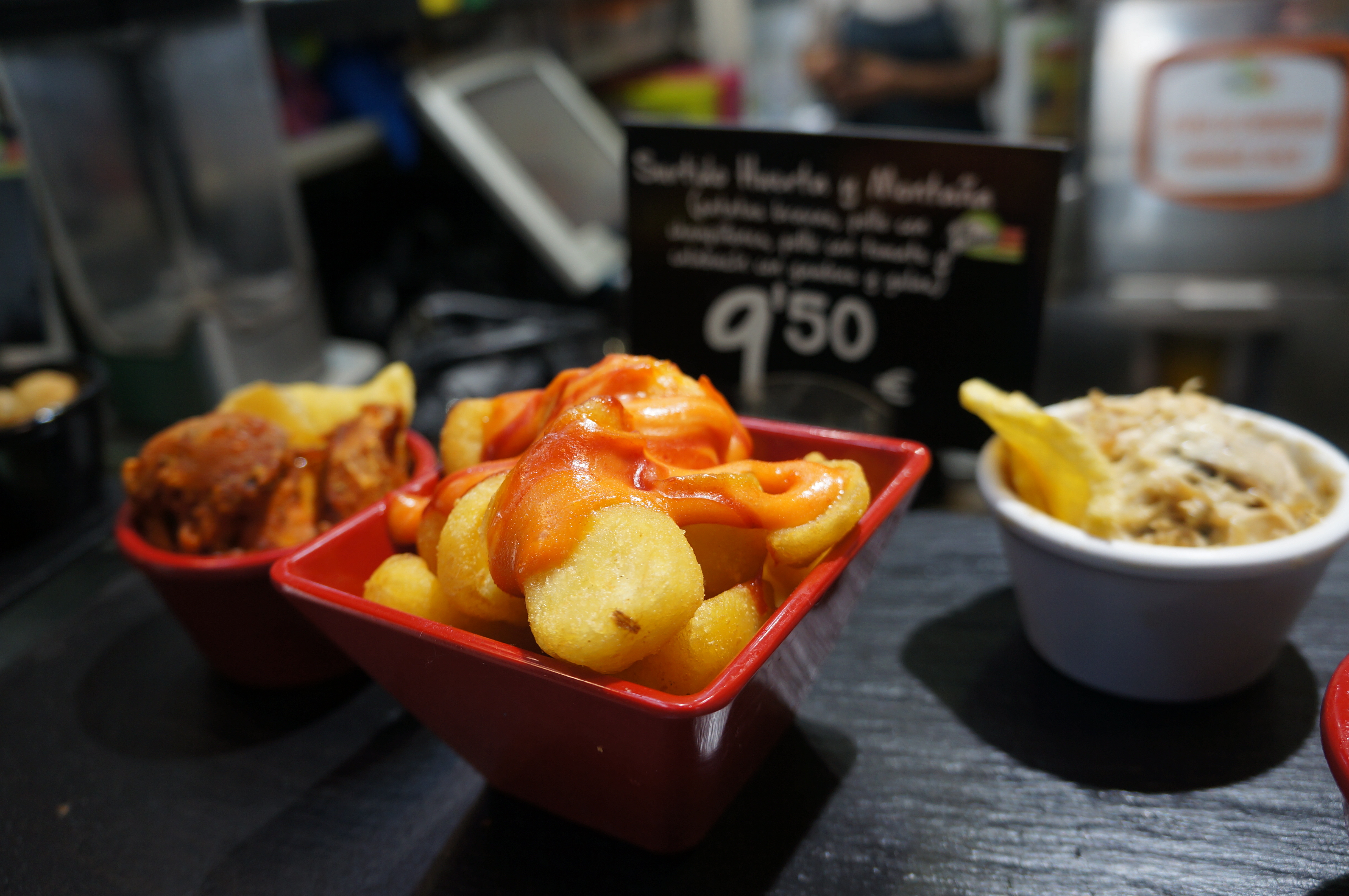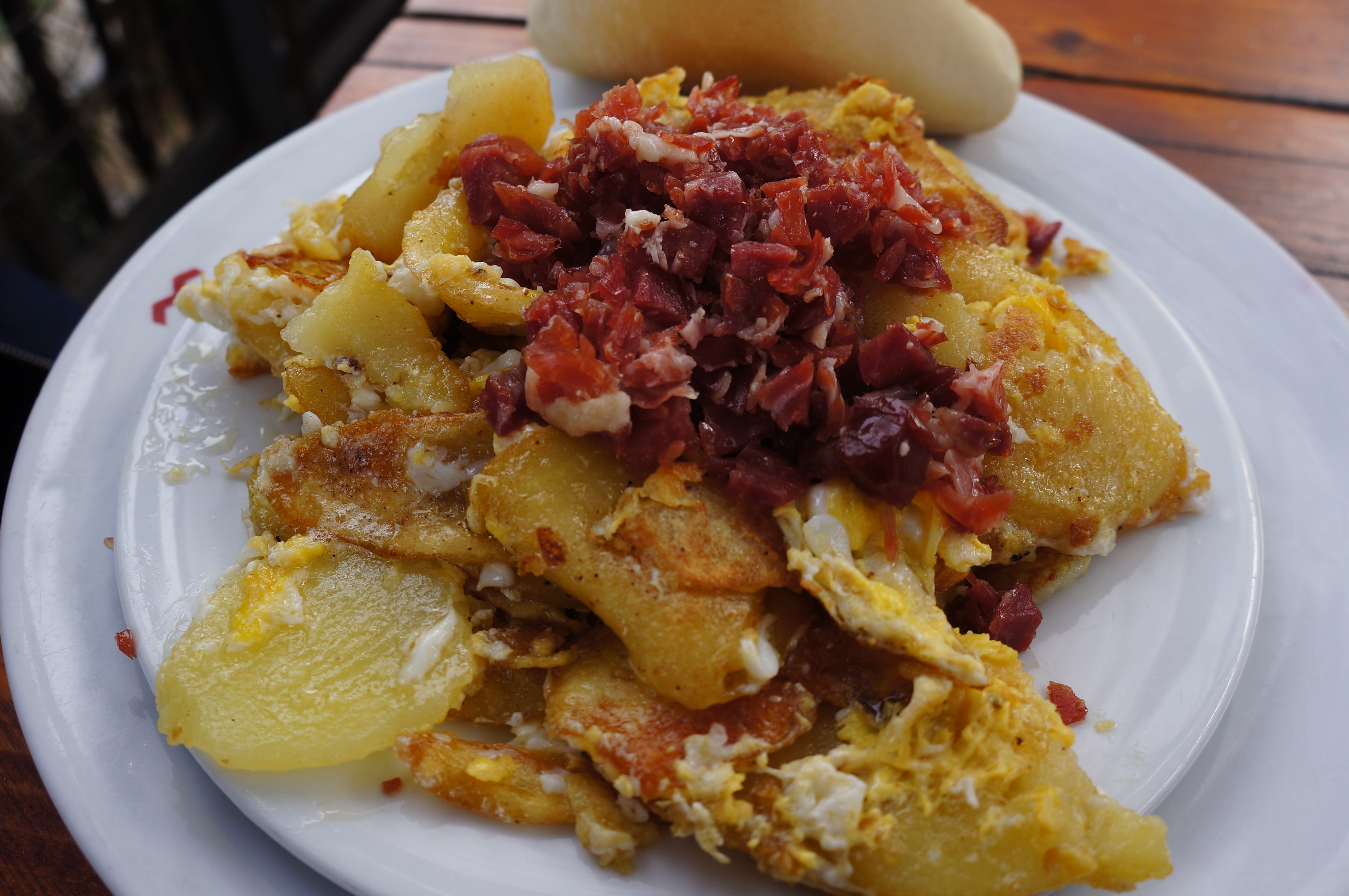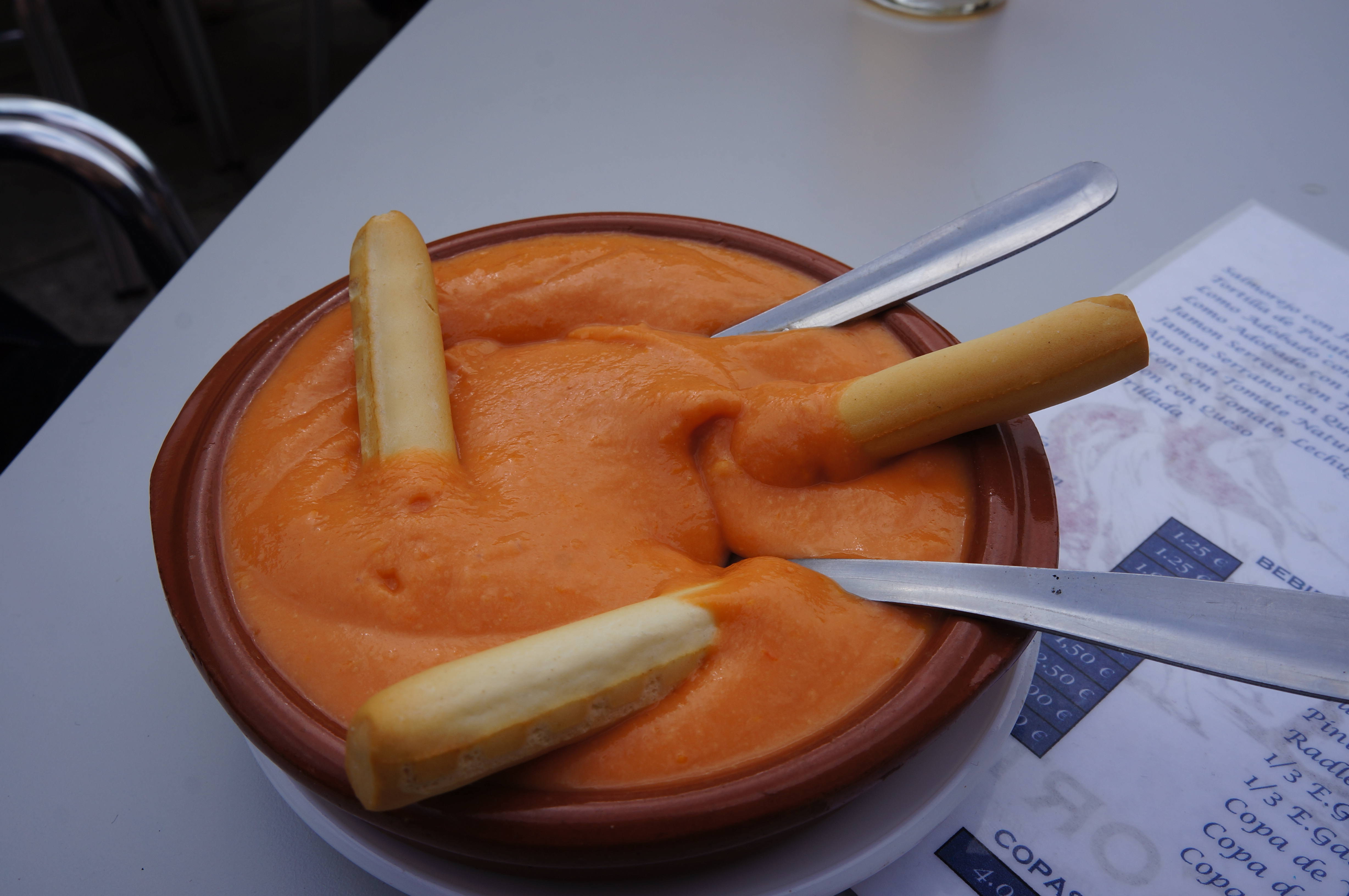 The below soup is not gazpacho, but salmorejo – fresh tomatoes mixed with garlic, bread, olive oil and sherry vinegar. It is eaten cold and most people top it with a hard boiled egg and Spanish ham (jamon). We did not pay for the soup – it came as a free tapas as so often in Spain.