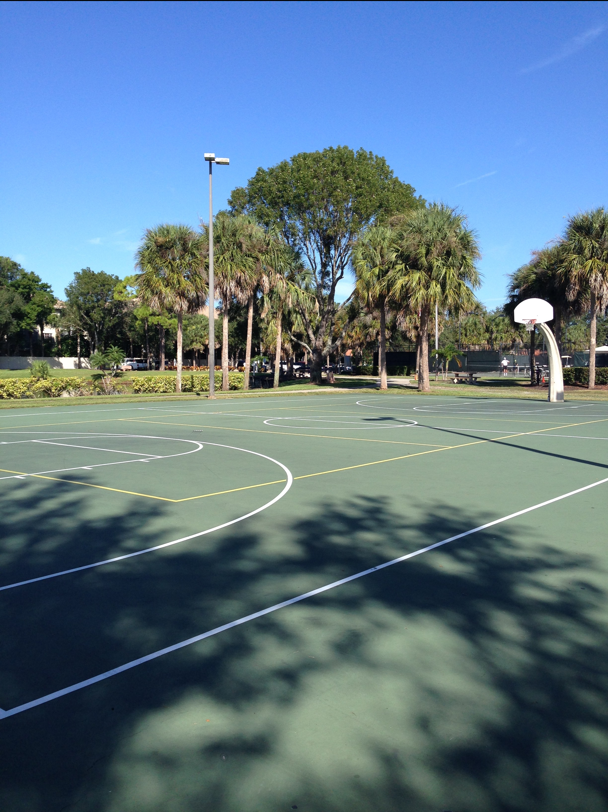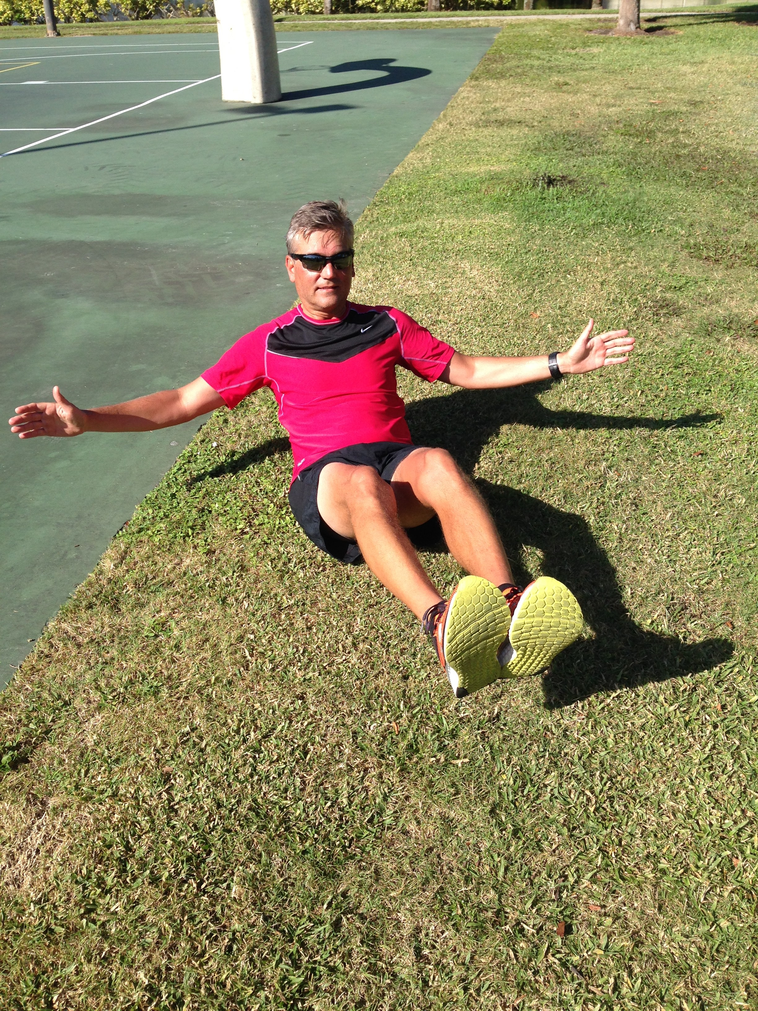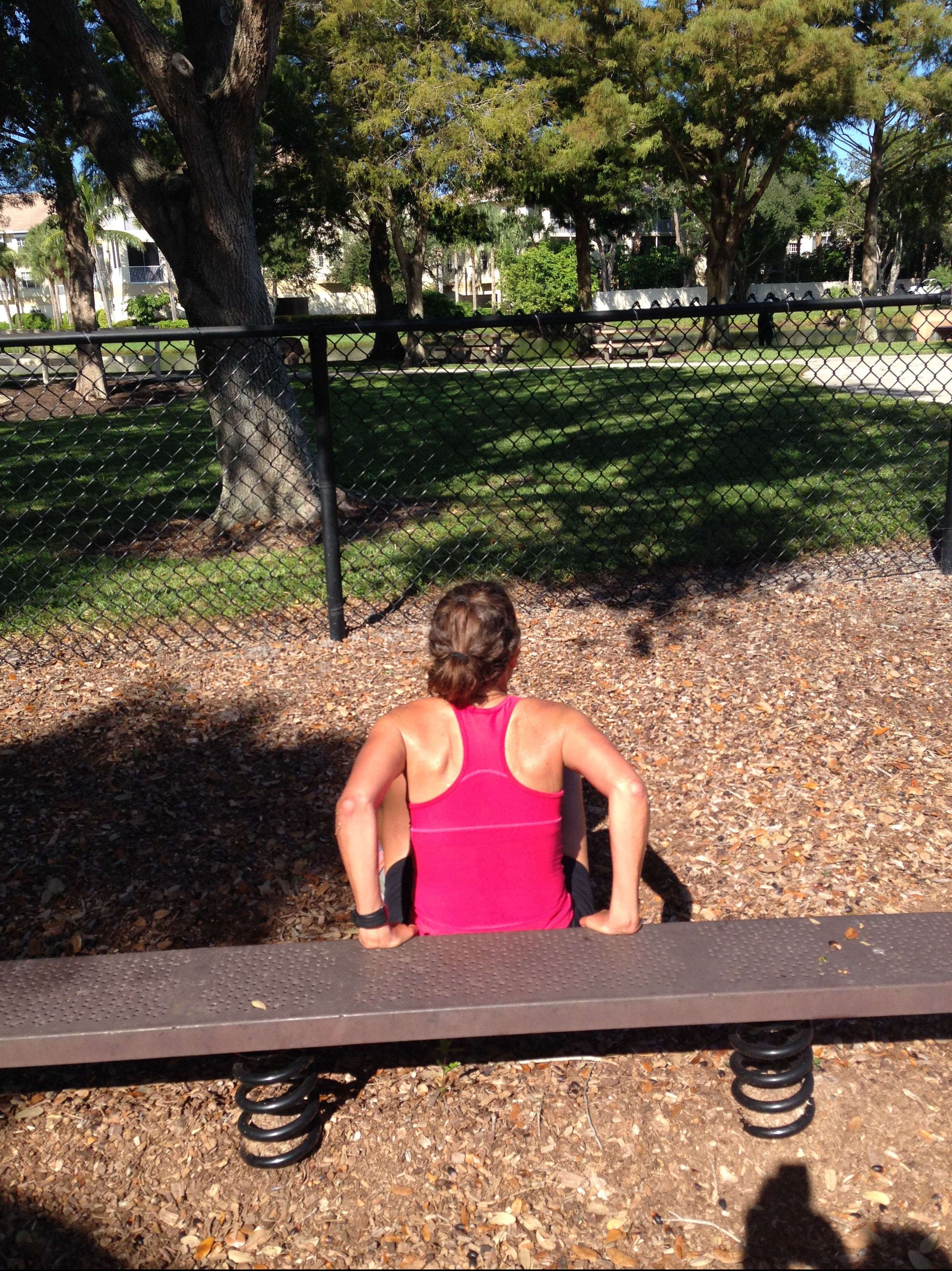 Then, we arrive at a community park that has a football field, basketball and tennis courts and a playground. We use this area for some strength training… push-ups, pull-ups, lunges, squats, crunches and all the good stuff: